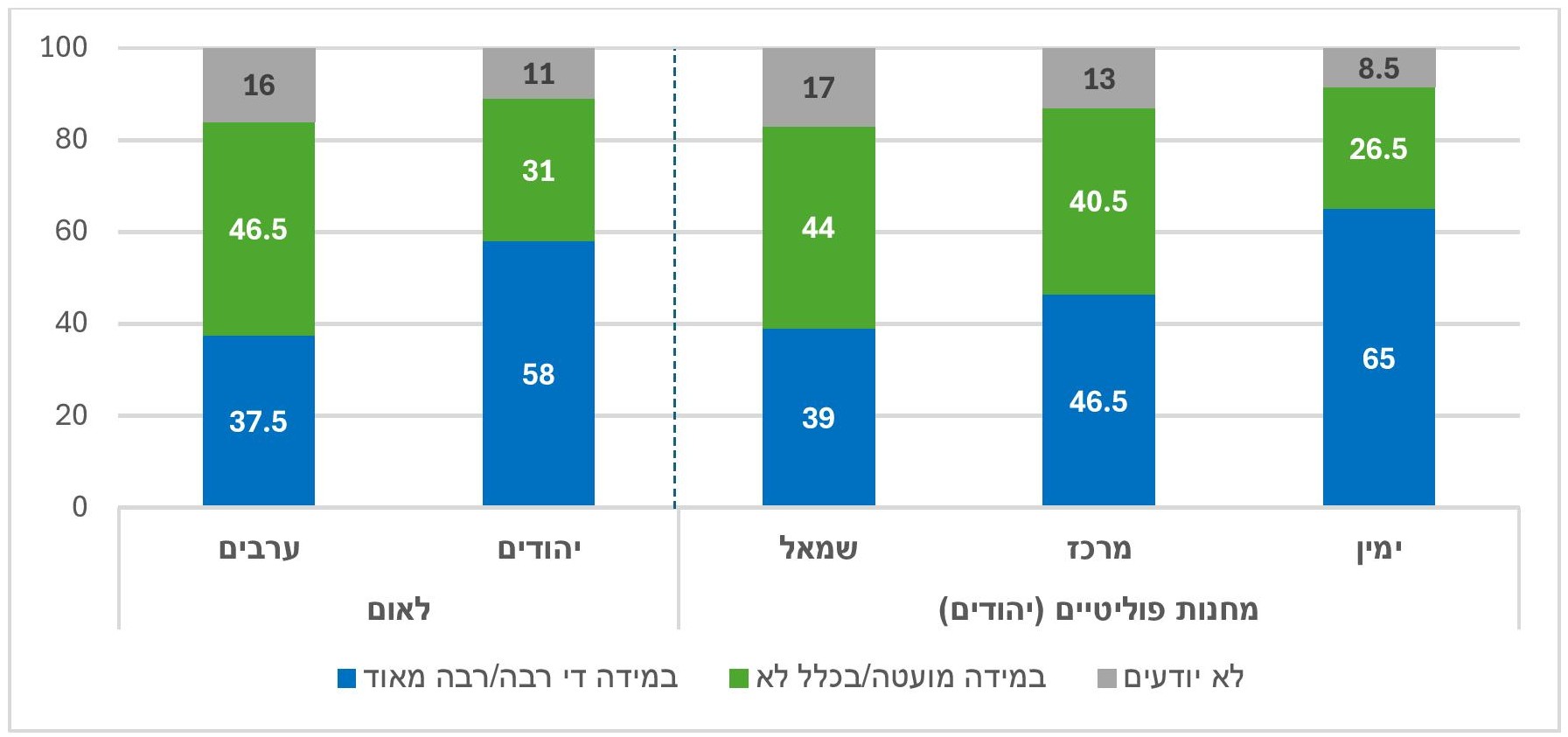 - שני שלישים בימין (יהודים) גרסו שהמדינה ערוכה להגנה על תשתיות חיוניות לעומת פחות ממחצית המשיבים במרכז ועוד פחות מכך (כ-40%) מהמשיבים בשמאל.