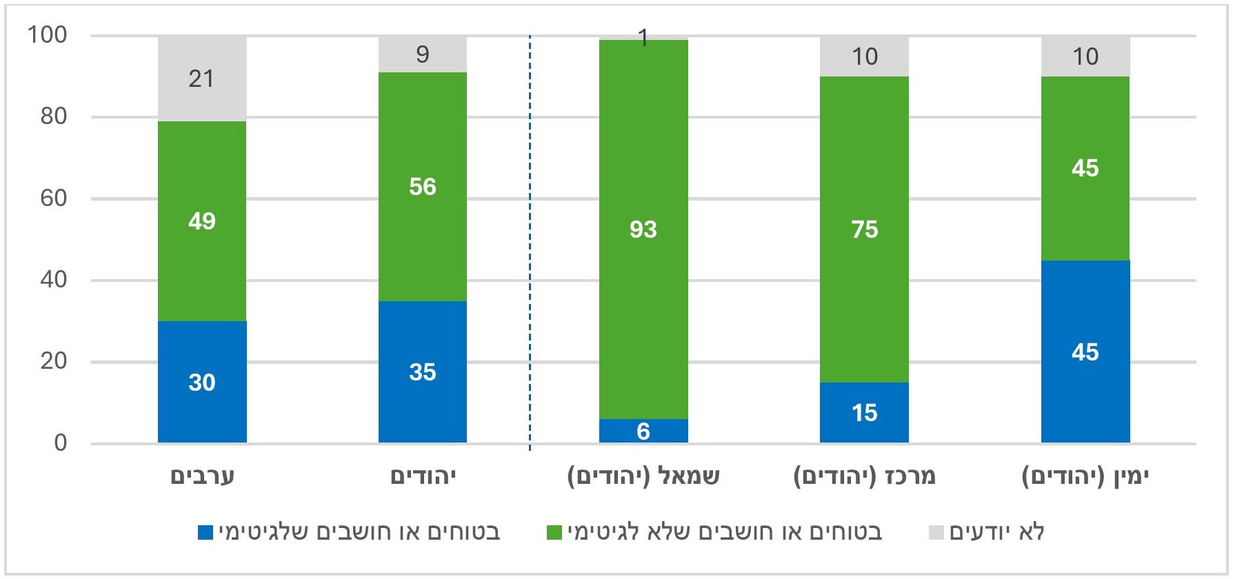 - פילוח של התשובות לפי מחנות פוליטיים (יהודים) מראה שיוויון בין המחזיקים בכל אחת מהדעות הללו במחנה הימין, לעומת רוב משמעותי במרכז, ועוד יותר גדול בשמאל, הגורסים שההתערבות לא לגיטימית.