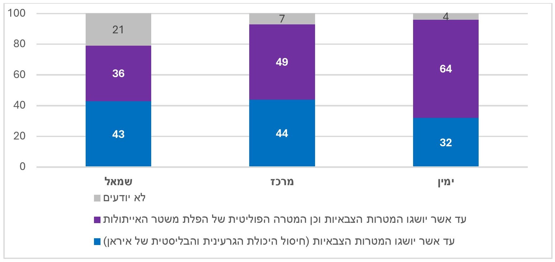 - בקרב היהודים הרוב סבורים שיש להמשיך במבצע עד השגת המטרות הצבאיות והמטרה הפוליטית של הפלת משטר האייתולות גם יחד (57%). זאת לעומת 36% הסבורים שיש להפסיק אחרי השגת המטרות הצבאיות בלבד.