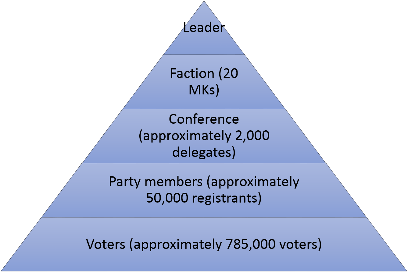 However, it should be noted that the actual number of party members who participate in party primaries is far below the potential turnout. For example, in the Likud primaries held ahead of the 2015 general election, 50,000 votes were cast, compared to 985,000 citizens who voted for the party. In other words, only 5% of all Likud voters participated in the primaries. In the Labor party, the the phenomenon is similar. There are 50,000 eligible voters in the primaries but, based on previous contests, only some 35,000 are expected to participate, meaning that only 4.5% of people who voted for the Zionist Camp (around 800,000) in the last election voted in the party primaries (see Figure 1).
