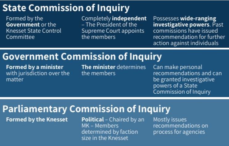 One recent example of such a commission is the Winograd Commission, which was established to investigate after the 2006 Second Lebanon War. Unlike the current commission, the Winograd commission was granted the powers of a state inquiry commission.