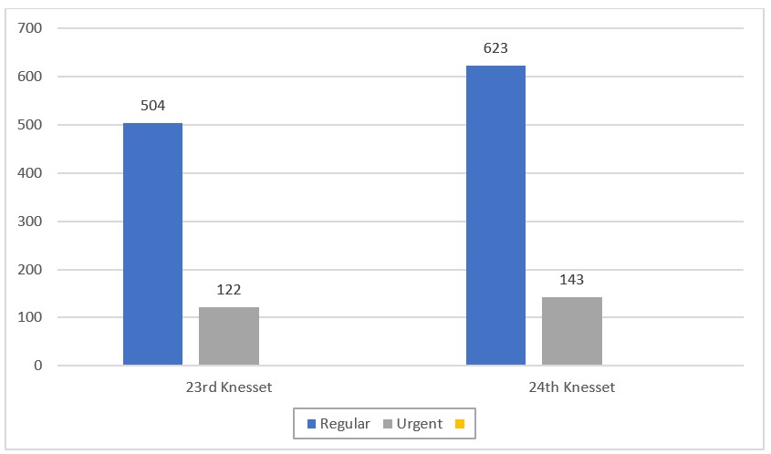The 24th Knesset has dispersed, around a year and a quarter since it was sworn in. While this is a very short period of time, it is longer than the three previous Knesset’s terms, none of which served longer than a year. The most prominent finding in the following review is that this Knesset continued the trend set by its predecessor: Both saw a dramatic increase in the number of private members’ bills put forward, and a dramatic reduction in the proportion of such bills that passed a third reading and became laws ( which can also be attributed to the brief terms of these two Knessets, cutting short legislative procedures before their completion). This constitutes a severe exacerbation of a problem which has a significant effect on the functioning of the Knesset: Countless private members’ bills, the vast majority of which do not evolve into legislation. This is a waste of the resources of the members of the Knesset (MKs), their staffs, and professional teams at the Knesset, and comes at the expense of more substantive and meaningful work, particularly- oversight of the Government.