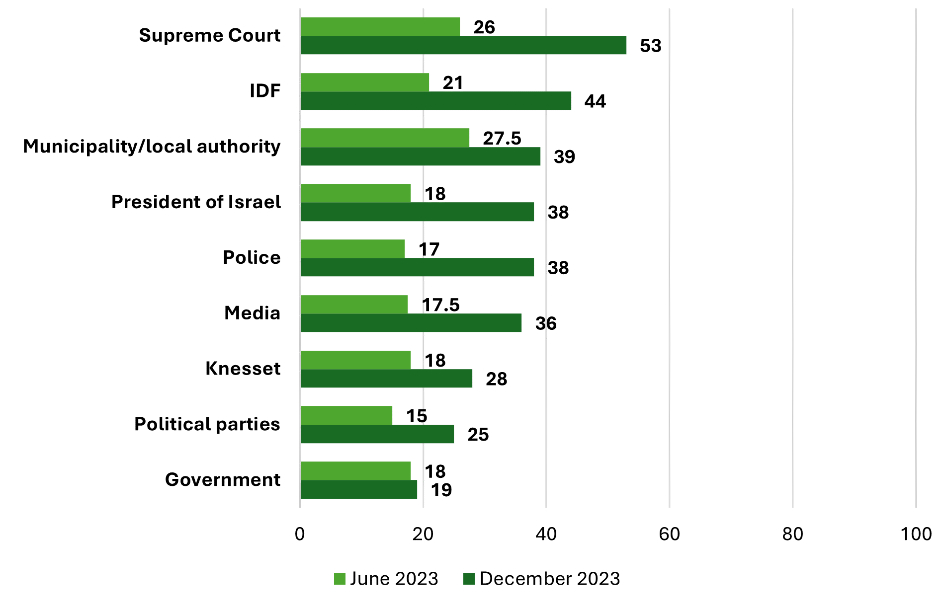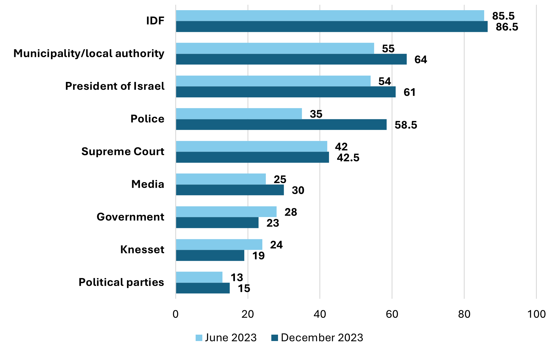 Trust in state institutions, June and December 2023 (Jewish sample; %)