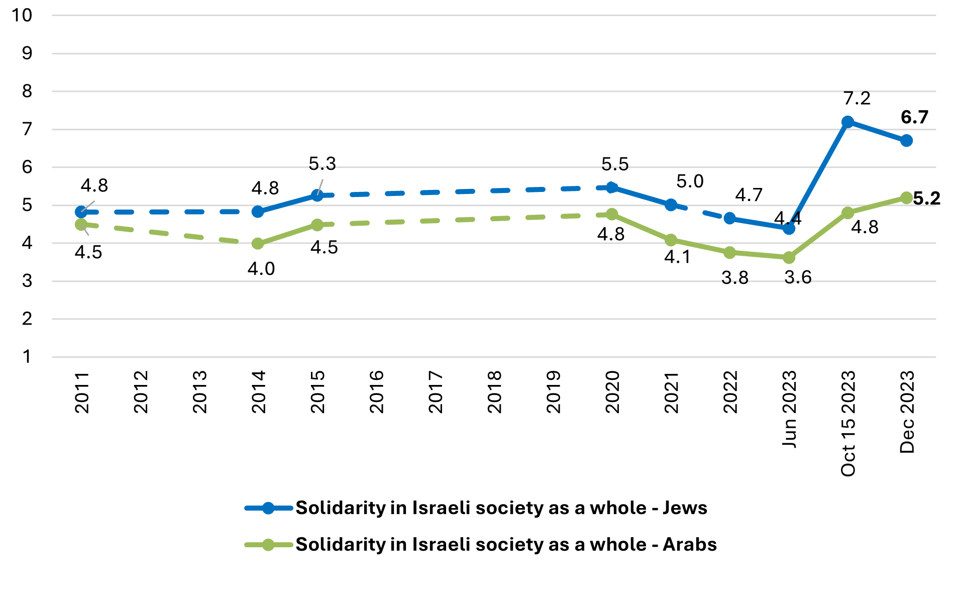 How would you rate the level of solidarity (sense of “togetherness”) of Israeli society as a whole (Jews, Arabs, and all other citizens), where 1 = “no solidarity at all” and 10 = “a high level of solidarity”? 2011–2023 (Jewish and Arab samples; Average)