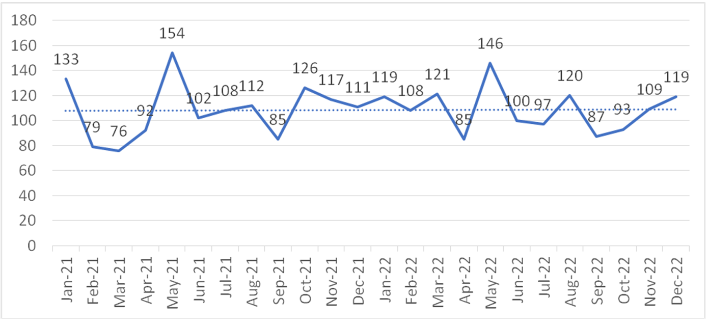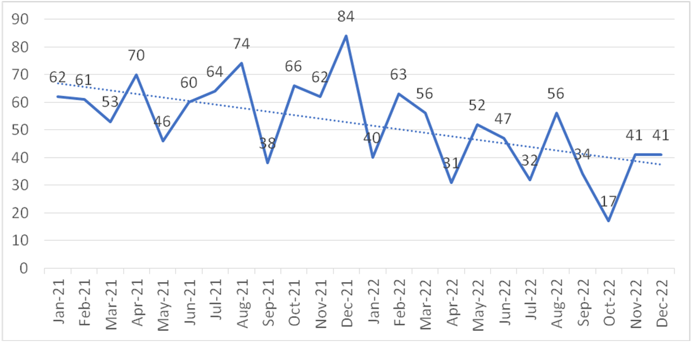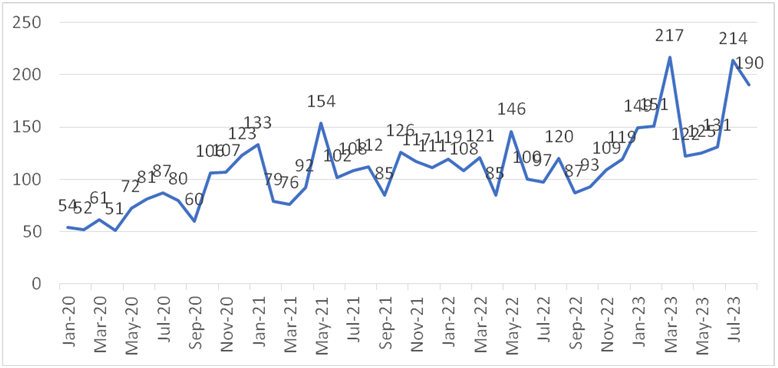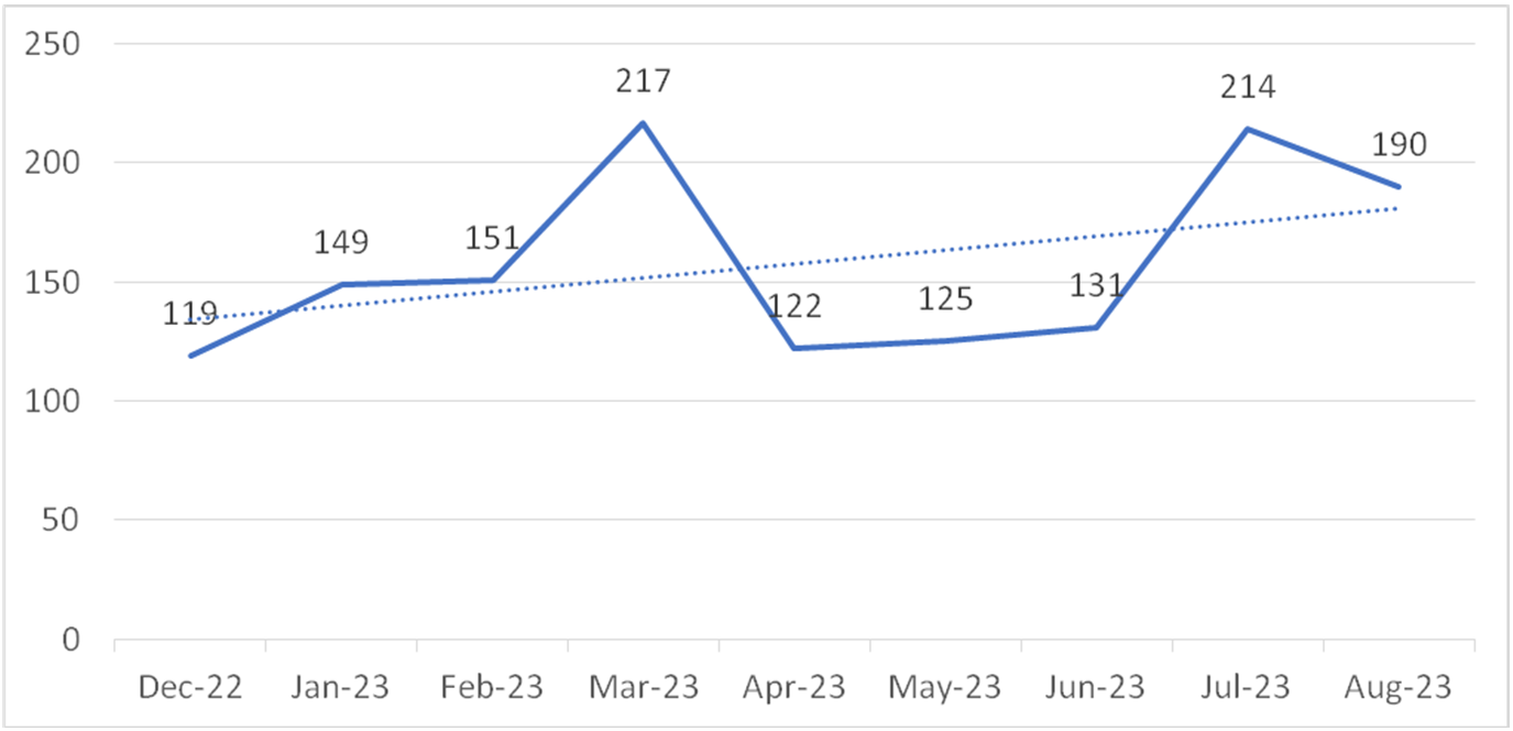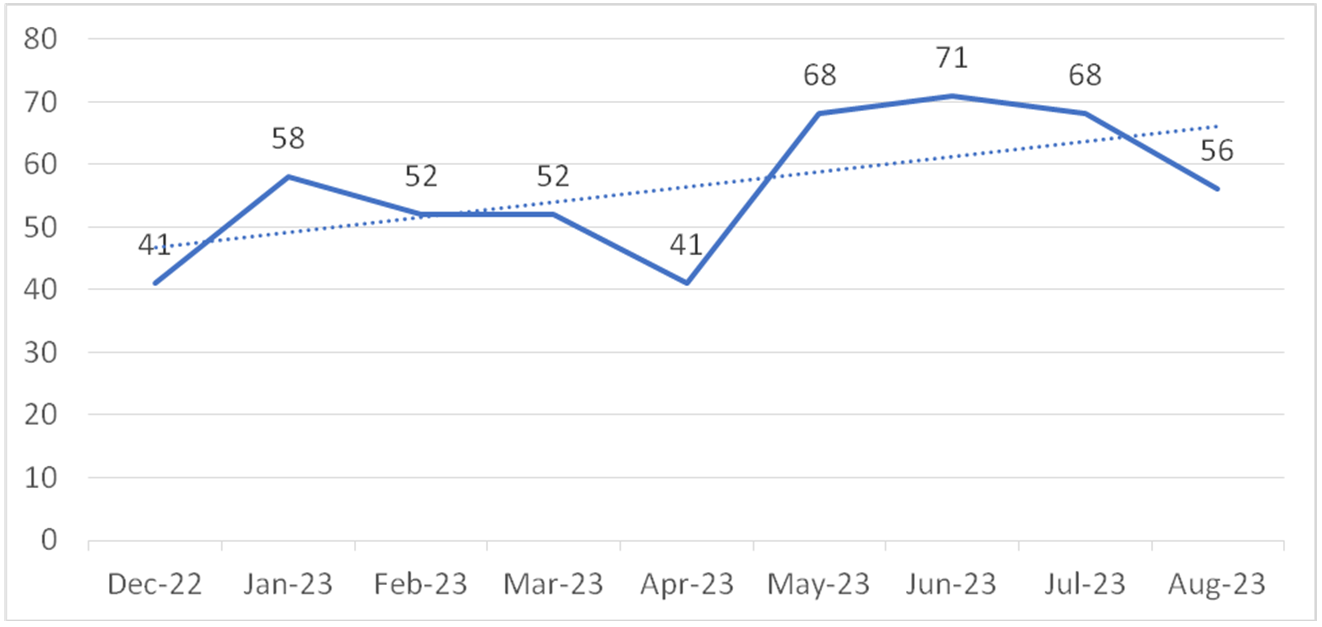- In the first eight months of 2023 there was a 45% increase in the average number of monthly complaints of police violence submitted to the DIPI, as compared to the corresponding period in 2022 (or a rise of 49% relative to the last eight months of 2022).
