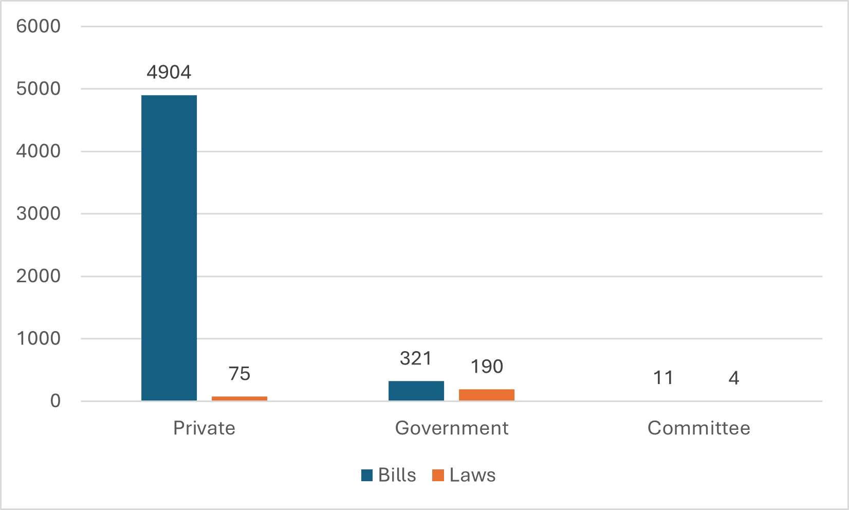 According to the Knesset’s National Legislation Database, since the current Knesset was sworn in (on November 15, 2022), a total of 5,236 bills have been submitted—4,904 private member bills, 321 government bills, and 11 bills put forward by Knesset committees. Of these, 269 bills completed the legislative process—75 private member bills, 190 government bills, and four Knesset committee bills. What stands out here is the huge discrepancy between the very large number of private member bills submitted and the small number passed into law: Of all the bills submitted, 94% were private and only 6% were government, while of all those actually passed into law, 71% were government bills and 28% were private member bills. This discrepancy stems from the fact that only a tiny proportion of private member bills submitted pass their third reading in Knesset.