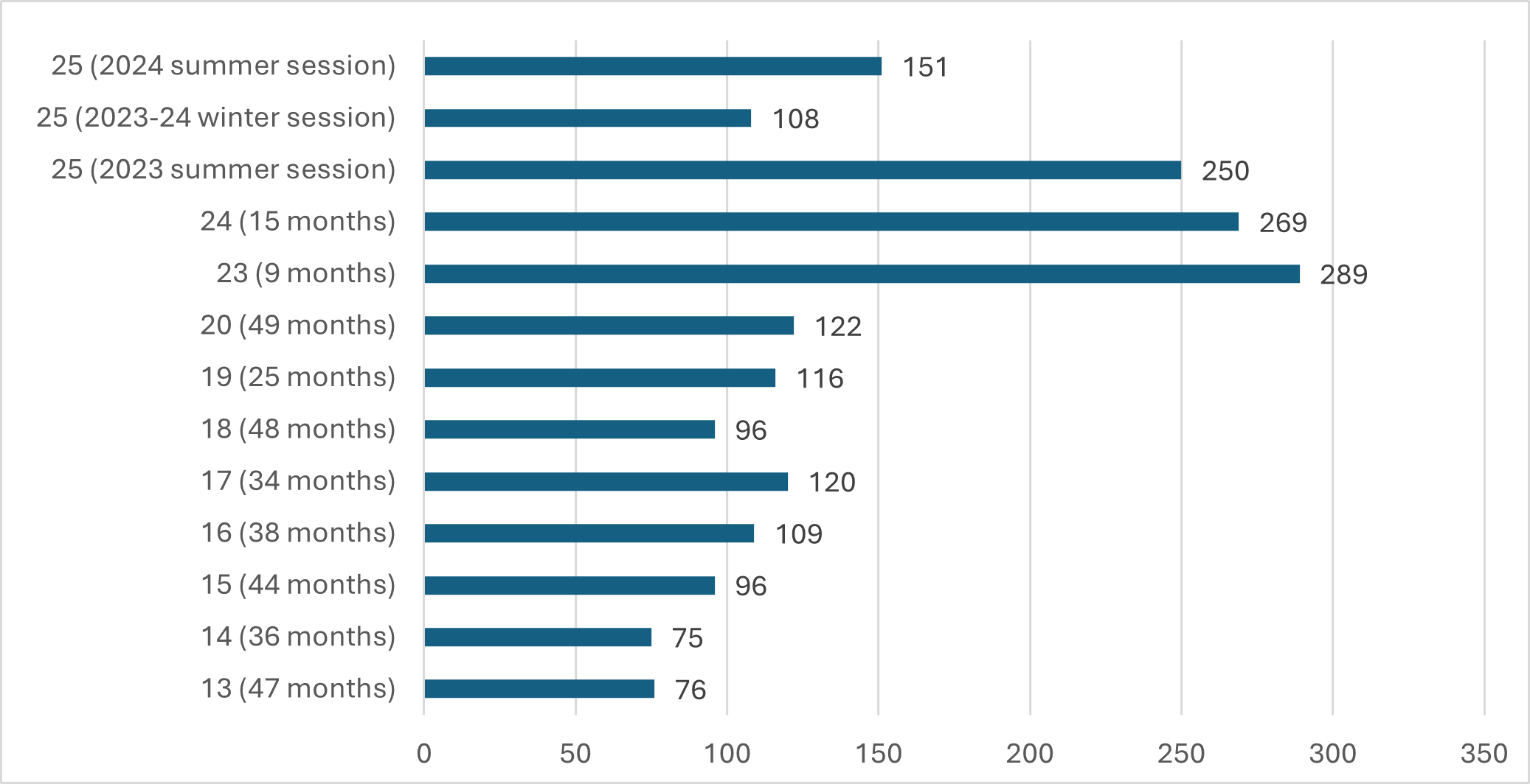 In this context, as Figure 2 shows, the quantity of private member bills (as a monthly average) submitted during the recent summer session, while still lower than in the past, is higher than that of the previous session, winter 2023–2024. Presumably, this can be attributed to the war that began on October 7: With the outbreak of war, the number of private member bills dropped sharply, seemingly because the Knesset members channeled their parliamentary work in other directions (such as work in Knesset committees or grassroots activities). Another possible reason could be that during normal times, the government uses members of the coalition to advance private member bills that it is interested in advancing (instead of using the much more complex and convoluted route of government legislation, and thus bypassing the need for an opinion from the attorney general). While during the war, the government itself put forward fewer bills that are not related to the war, and thus made less use of private member bills from coalition members (particularly during the period of the “emergency government” established at the beginning of the war, as the coalitionary agreement stated that bills not directly related to the war would only be put forward with the approval of the chair of the Likud party and the chair of the National Unity party). This decline was particularly evident during the winter session; during the recent summer session, the continuing war was in a less intensive phase, and consequently the number of private member bills rose, though it remained lower than before the war.