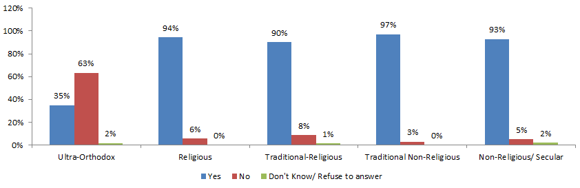 When analyzing the perception of Israel Independence Day among Jewish respondents who define themselves as having different levels of religiosity on the religious-secular spectrum, it emerges that in all groups except for the ultra-Orthodox,  a large majority sees Yom Ha'atzmaut as a holiday. The majority of ultra-Orthodox (Haredi) respondents (63%) does not see Independence Day as a holiday (Figure 2). However, the fact that about one-third of those who define themselves as Haredi see Independence Day as a holiday may strengthen the hypothesis that a considerable share of ultra-Orthodox Jews in Israel are beginning to identify with the State of Israel.