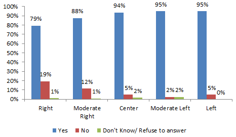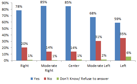 An analysis of the relationship between the position of respondents on the right-left political-security spectrum and their views of Independence Day indicates that in the total sample, the perception of Independence Day as a holiday is lower among respondents who define themselves as on the left than among respondents who define themselves as on the right (Figure 3). This is due to the fact that a high percentage of Arabs, most of whom do not see Independence Day as a holiday (as mentioned above), define themselves as left wing. An analysis of the Jewish sample only, however, indicates that a high rate of respondents in all groups see Independence Day as a holiday (over 88 %), and it is actually the group that defines itself as right wing that has a lower rate of perception of Yom Ha'atzmaut as a holiday (Figure 4). The reason for this is that many ultra-Orthodox Jews, two-thirds of whom do not see Independence Day as a holiday, identify themselves as being on the political right. Indeed, when the responses of the Jewish sample are analyzed with the ultra-Orthodox responses excluded, the rate of recognition of Independence Day as a holiday is very high (91%) and is similar among both the right and the left.