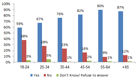 The survey also found that adults tend to see Independence Day as a holiday more than younger people (95% of respondents aged 45 and over, as compared to less than 70% of respondents aged 18–44).