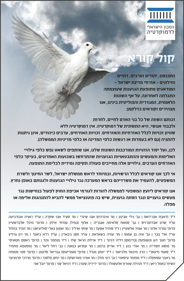 We gathered together, Jews and Arabs, religious and secular, citizens of the State of Israel who are worried by the phenomenon of racism that has intensified in recent days. Despite our differences of nationality, gender, and political views, we declare the following:
