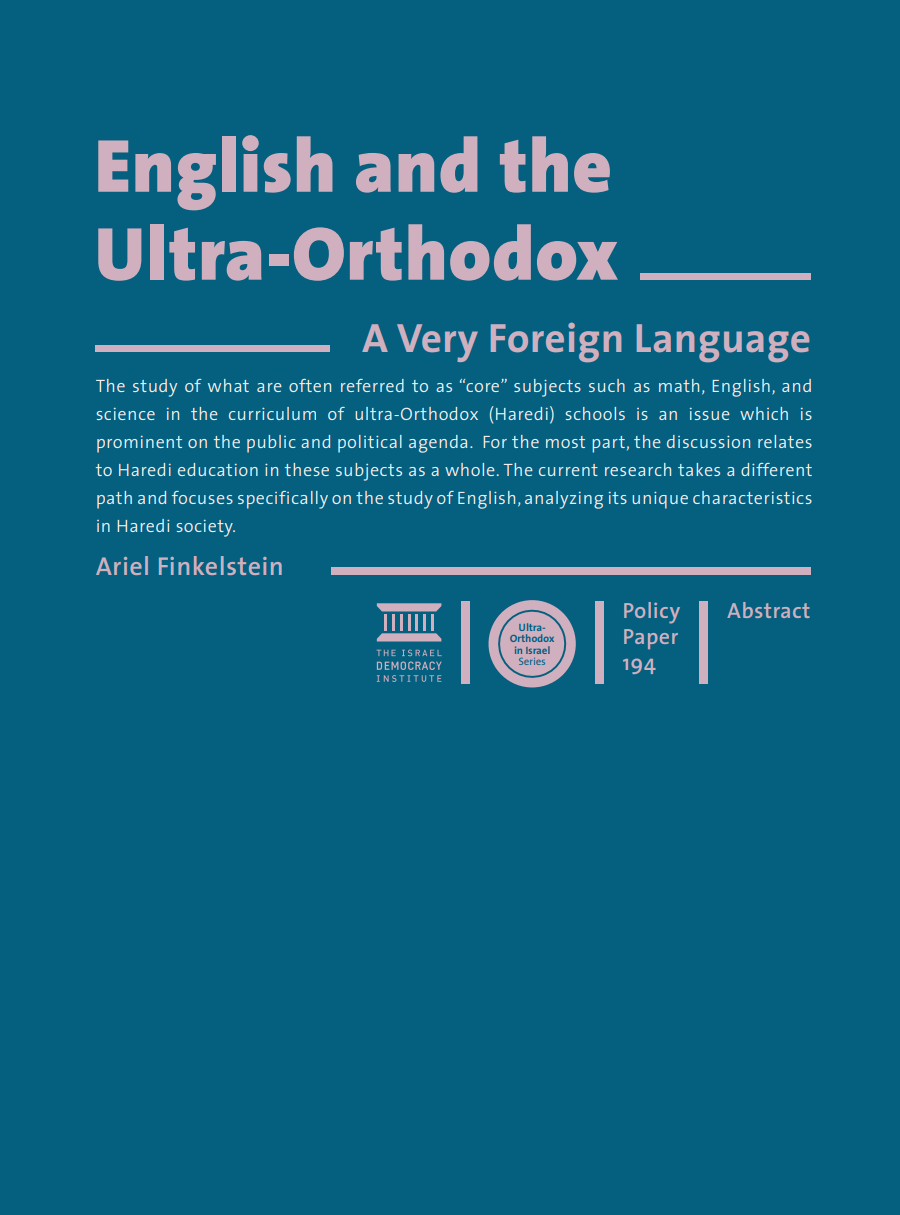 One of the most controversial issues on the public agenda in Israel and which has profound implications for the integration of the Haredi community is the opposition of the Haredi mainstream to including core subjects—such as science, math, science, and English—in the curriculum of Haredi schools, especially schools for boys. These subjects, and essential to ensure that graduates of Haredi schools are equipped with those tools that are vital tools for their functioning as informed and involved citizens and for finding employment in today’s job market. Core curriculum studies in Haredi society are usually discussed as one package. This study takes a different path, focusing only on English—and pointing out its unique status in Haredi society. The importance of this subject is not in question: English is currently the international language, and proficiency in English is a prerequisite for studying in institutions of higher education and for integration into the job market. Moreover, language study differs fundamentally from studies based mainly on imparting knowledge (science, history) or logical skills (math), making it more difficult to catch up and fill gaps later in life.