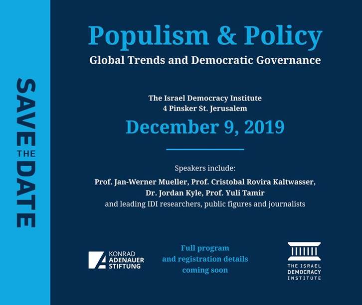 Speakers include: Prof. Jan-Werner Mueller, Prof. Cristobal Rovira Kaltwasser, Dr. Jordon Kyle, Prof. Yuli Tamir and leading IDI researchers, public figures and journalists. The conference is in partnership with Konrad Adenauer Stiftung