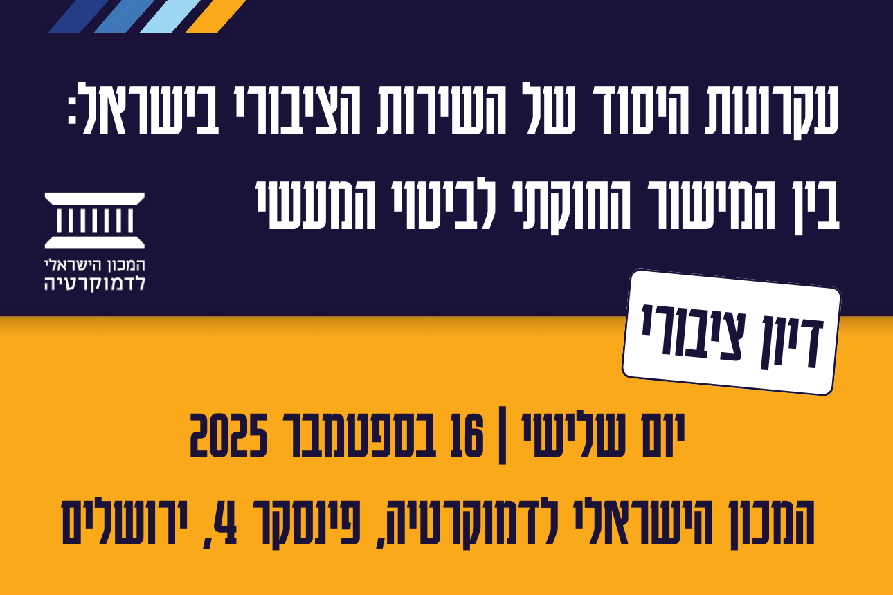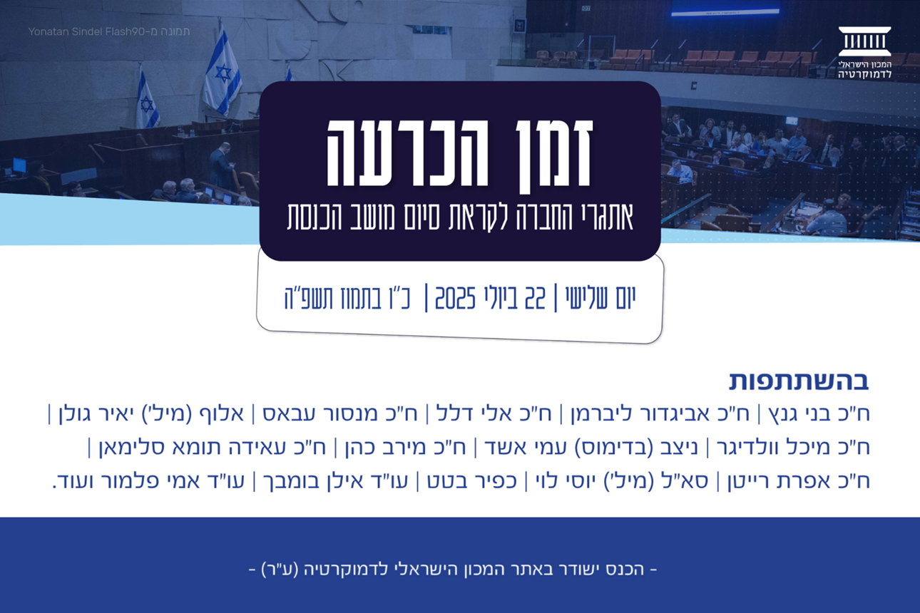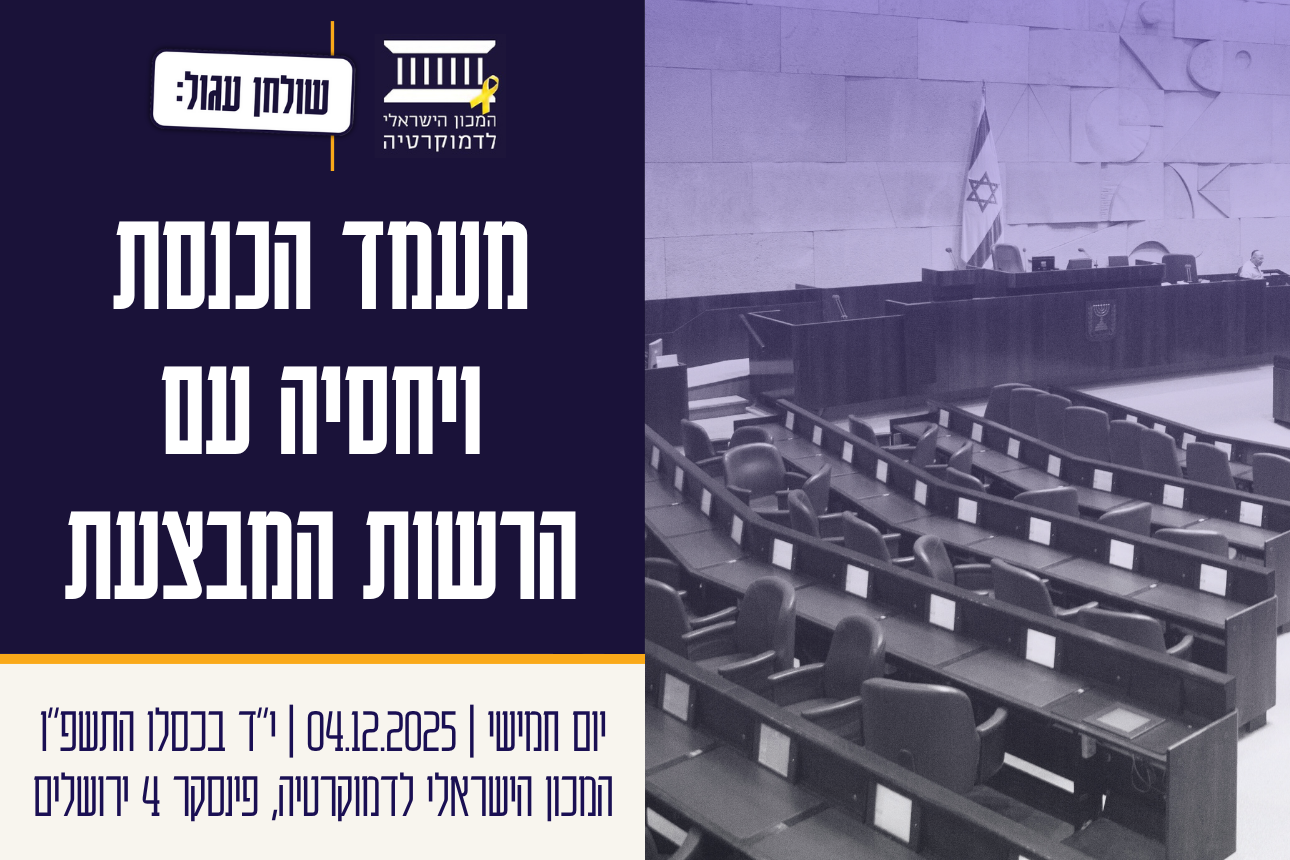יום עיון מקצועי בהשתתפות נציגים ונציגות מהממשל, אקדמיה, חברה אזרחית ומכוני מחקר | למוזמנים בלבד | ישודר בשידור חי באתר המכון הישראלי לדמוקרטיה