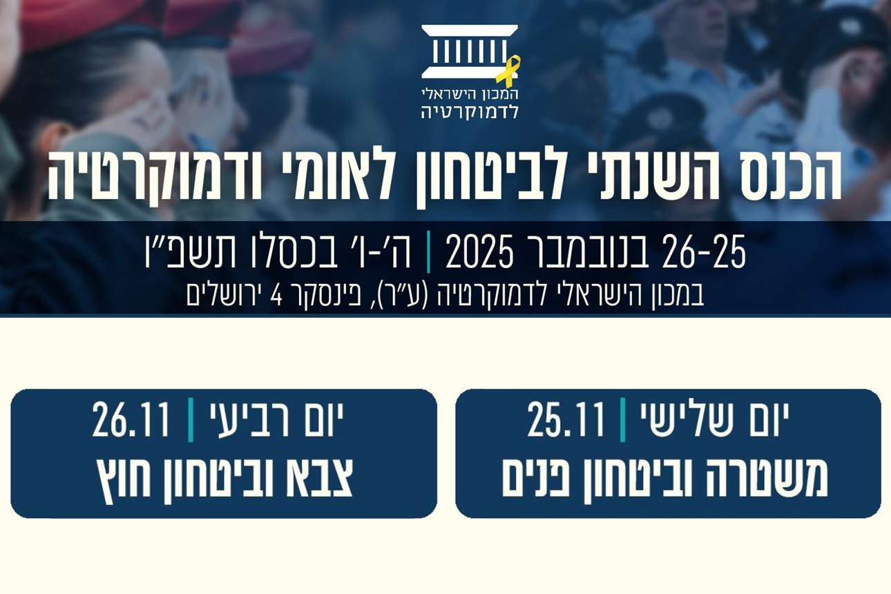 הכנס השנתי לביטחון לאומי ודמוקרטיה 2025, המתקיים על-רקע תמורות משמעותיות בביטחון הפנים והחוץ, יעסוק בסוגיות המרכזיות שעל סדר היום הציבורי המצויות בתפר שבין ביטחון ודמוקרטיה. היום הראשון של הכנס יוקדש לעיסוק בעולמות של ביטחון פנים ושיטור, במסגרתו נדון, בין היתר, בהתמודדות עם משבר הפשיעה החמורה בישראל, בשיטור הפגנות, בתמורות במדיניות רישוי הנשק הפרטי בישראל, ובתפקיד המשטרה בהבטחת תקינות וטוהר הבחירות בואנו שנת הבחירות לכנסת ה-26. היום השני יוקדש לעיסוק בעולמות של צבא וביטחון חוץ, במסגרתו נדון, בין היתר, במערך המילואים לאחר שנתיים של לחימה, בביקורת שיפוטית על פעילות מבצעית, ובאתגרים עמם מתמודדת מדינת ישראל במישור הבינלאומי. בהשתתפות גורמי ממשלה, שלטון מקומי, חברה אזרחית, אקדמיה וארגוני ביטחון ואכיפת חוק. הכנס יתקיים ב-26-25 בנובמבר 2025 במכון הישראלי לדמוקרטיה, פינסקר 4, ירושלים. הכנס למוזמנים בלבד וישודר בשידור חי באתר המכון. ייתכנו שינויים בתוכנית הכנס. לפרטים נוספים: ריטה רוסין, 02-5300849.