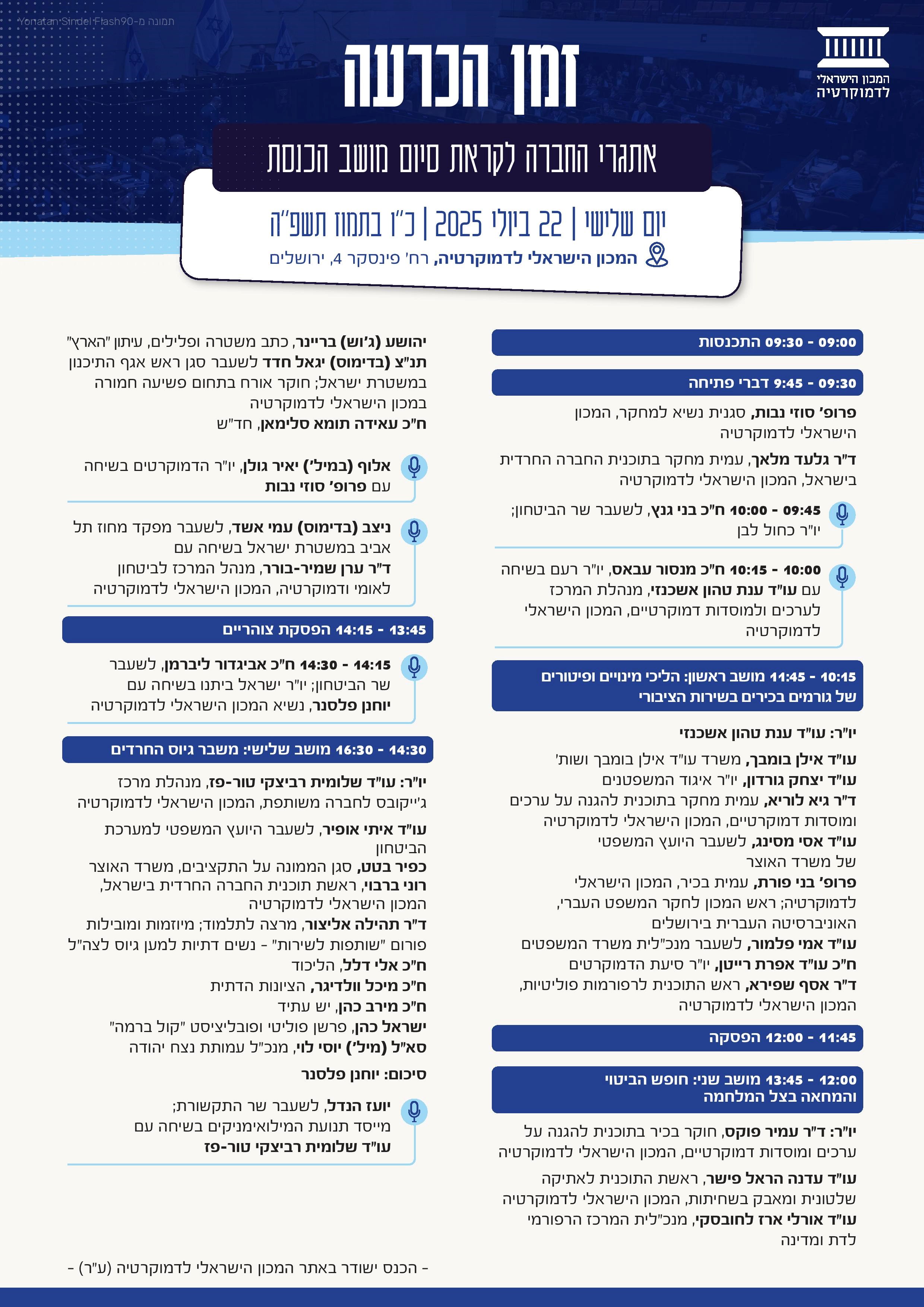 מושב הקיץ של הכנסת מסתיים כאשר על השולחן מונחת שורת נושאים משמעותיים במיוחד הממתינים להכרעה. כנס "זמן הכרעה" של המכון הישראלי לדמוקרטיה יעסוק בשלושה מהם: מינויים ופיטורים של בכירים בשירות הציבורי, חופש המחאה והביטוי ומשבר הגיוס.