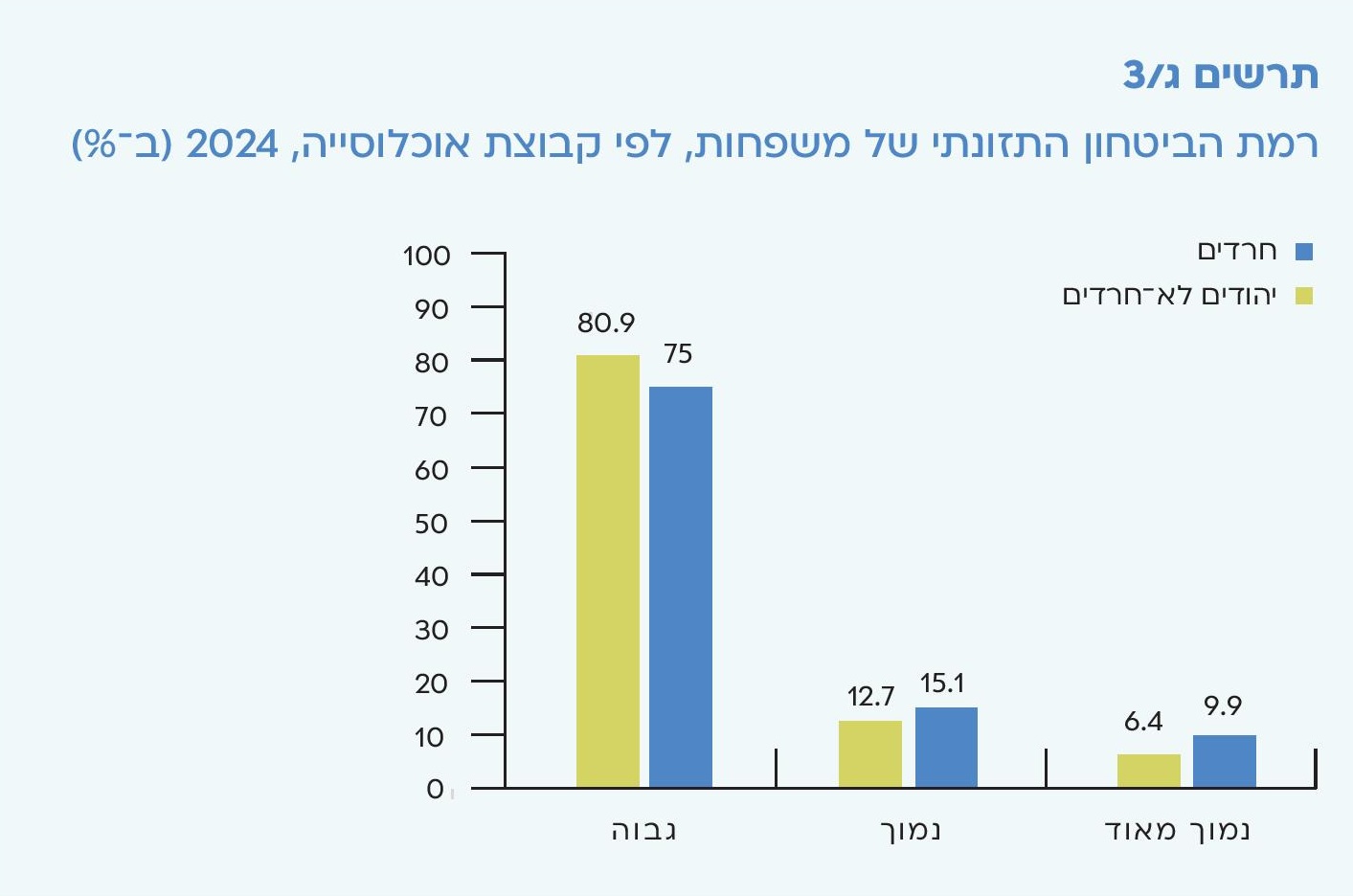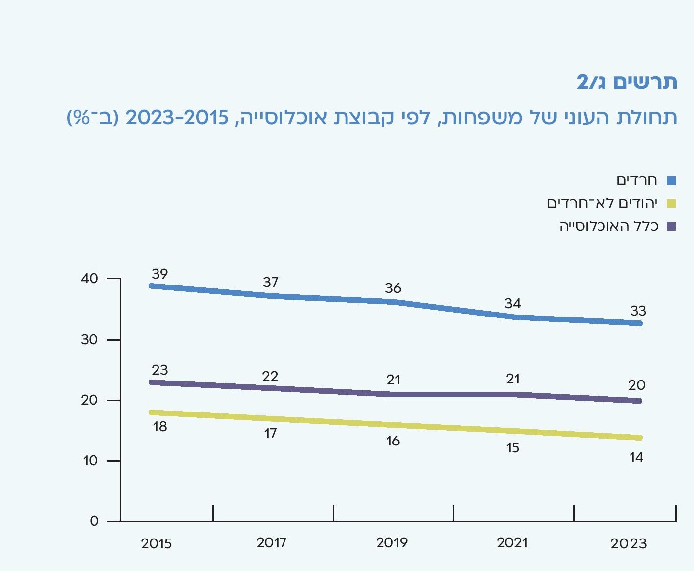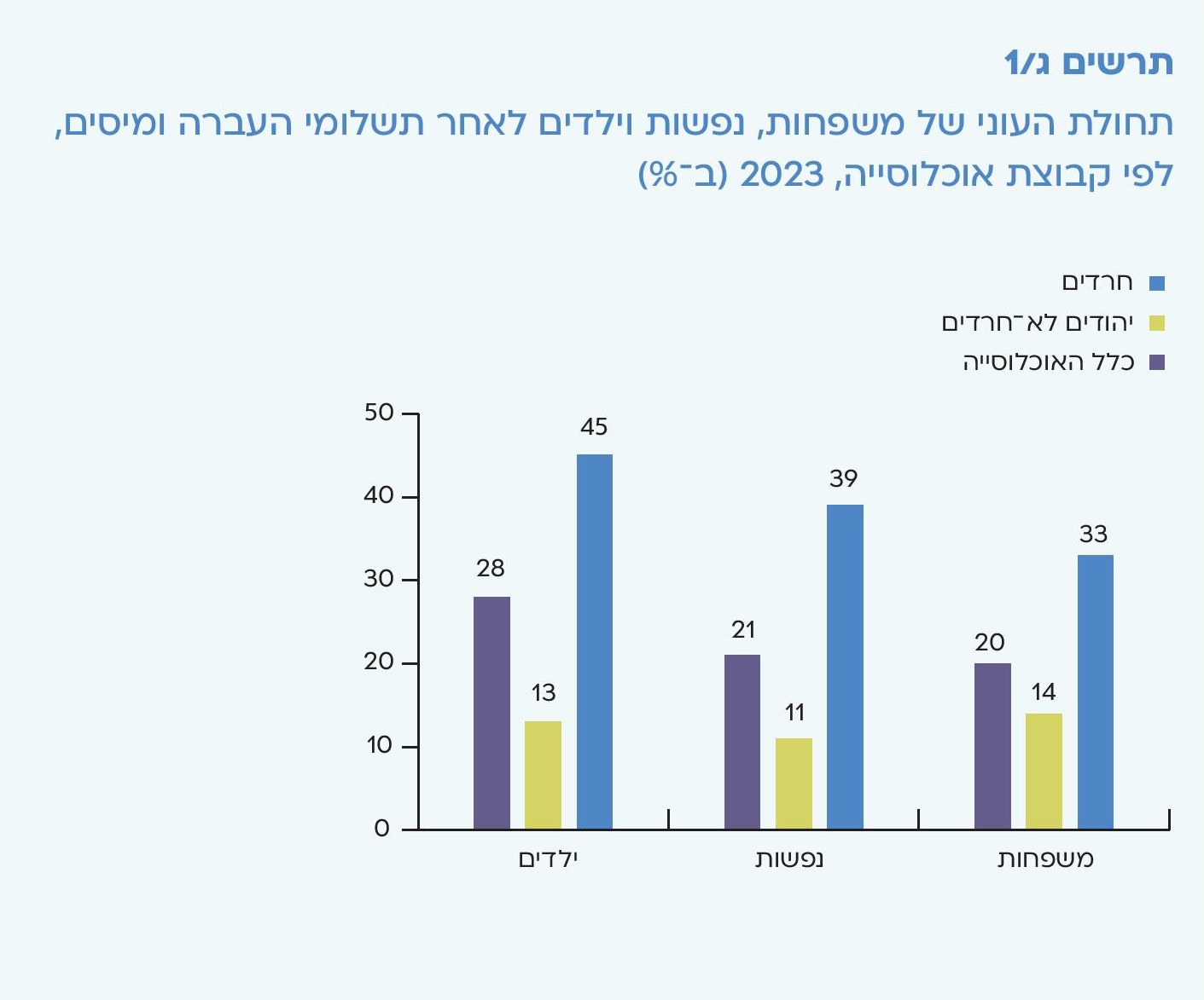 תמונת המצב של תחולת העוני לאחר תשלומי ההעברה והמיסים בחלוקה לנפשות, למשפחות ולילדים לשנת 2023 מלמדת כי שיעור הנפשות החיות מתחת לקו העוני לאחר תשלומי העברה ומיסים באוכלוסייה החרדית (39%) גבוה בהרבה משיעורן בכלל האוכלוסייה (20%) ומשיעורן באוכלוסיית היהודים הלא־חרדים (14%).