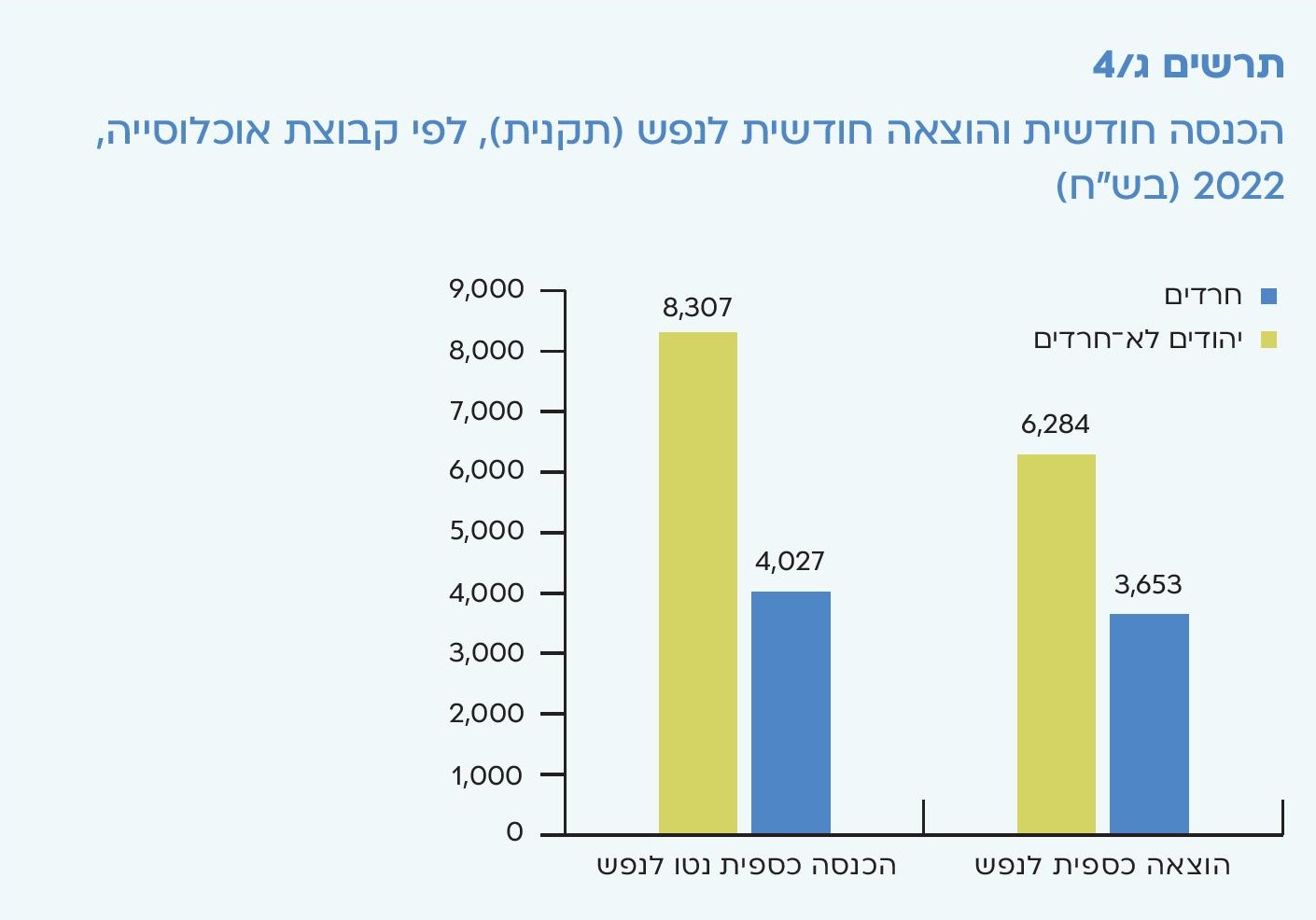 מקובל לחשב את ההכנסה לנפש על פי סולם הנותן משקל פוחת והולך לכל נפש בשל העלות השולית שלה למשק הבית. לפי חישוב זה, ההכנסה נטו לנפש תקנית במשפחה חרדית היא 4,027 ש"ח, והיא עומדת על 48% בלבד מההכנסה לנפש תקנית במשפחה יהודית לא־חרדית (8,307 ש"ח). הפער הגדול מוסבר במספר הנפשות הגבוה במשק הבית החרדי (5.1), לעומת משק הבית היהודי הלא־חרדי (2.8); במספר המפרנסים הממוצע; ובהכנסה נמוכה מעבודה (10,221 ש"ח במשק בית חרדי, לעומת 18,604 ש"ח במשק בית יהודי לא־חרדי). אפשר שבמציאות הפערים בהכנסות קטנים יותר בשל ההכנסות מעבודה שאינן מדוּוחות באוכלוסייה החרדית.