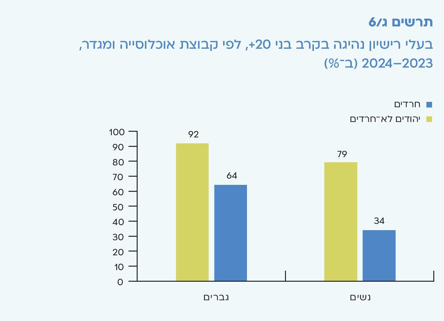 תרשים ג/6 בעלי רישיון נהיגה בקרב בני +20, לפי קבוצת אוכלוסייה ומגדר, 2023–2024 (ב־%)