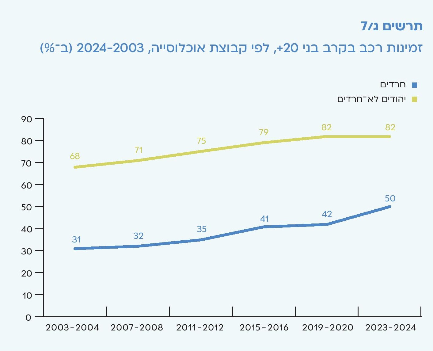 תרשים ג/7 זמינות רכב בקרב בני +20, לפי קבוצת אוכלוסייה, 2024-2003 (ב־%)