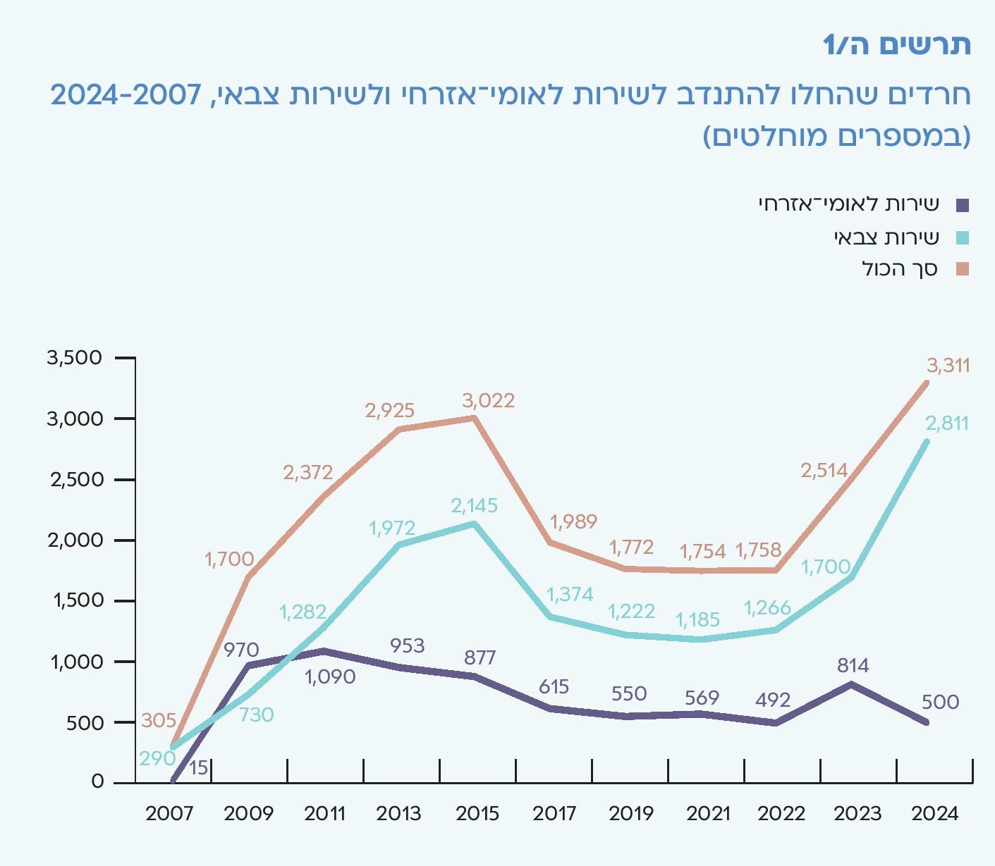 תרשים ה/1 חרדים שהחלו להתנדב לשירות לאומי־אזרחי ולשירות צבאי, 2024-2007 (במספרים מוחלטים)