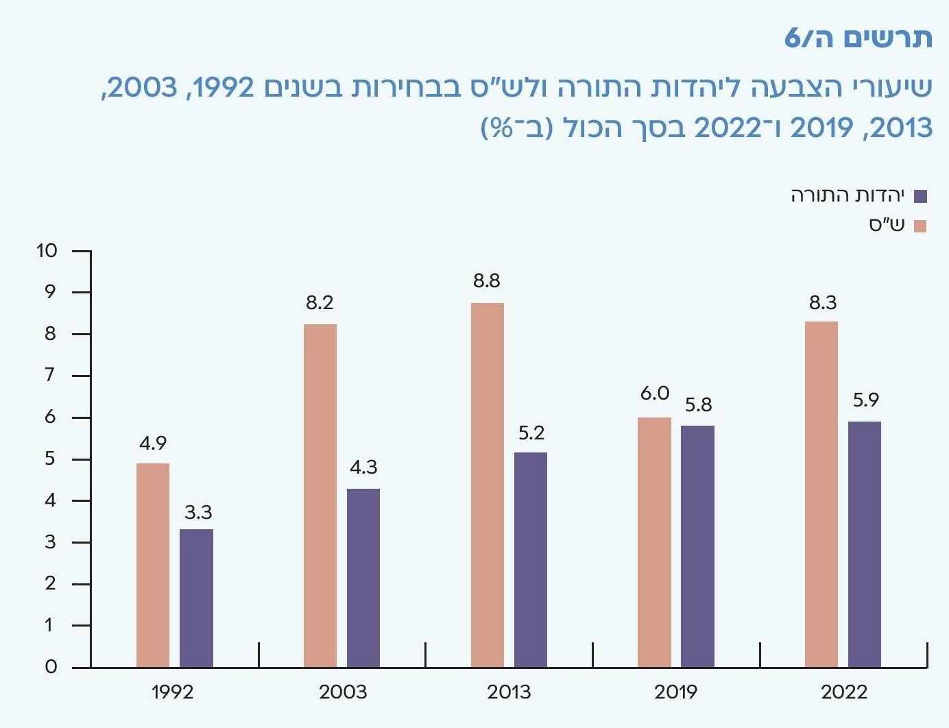 תרשים ה/6 שיעורי הצבעה ליהדות התורה ולש"ס בבחירות בשנים 1992, 2003, 2013, 2019 ו־2022 בסך הכול (ב־%)