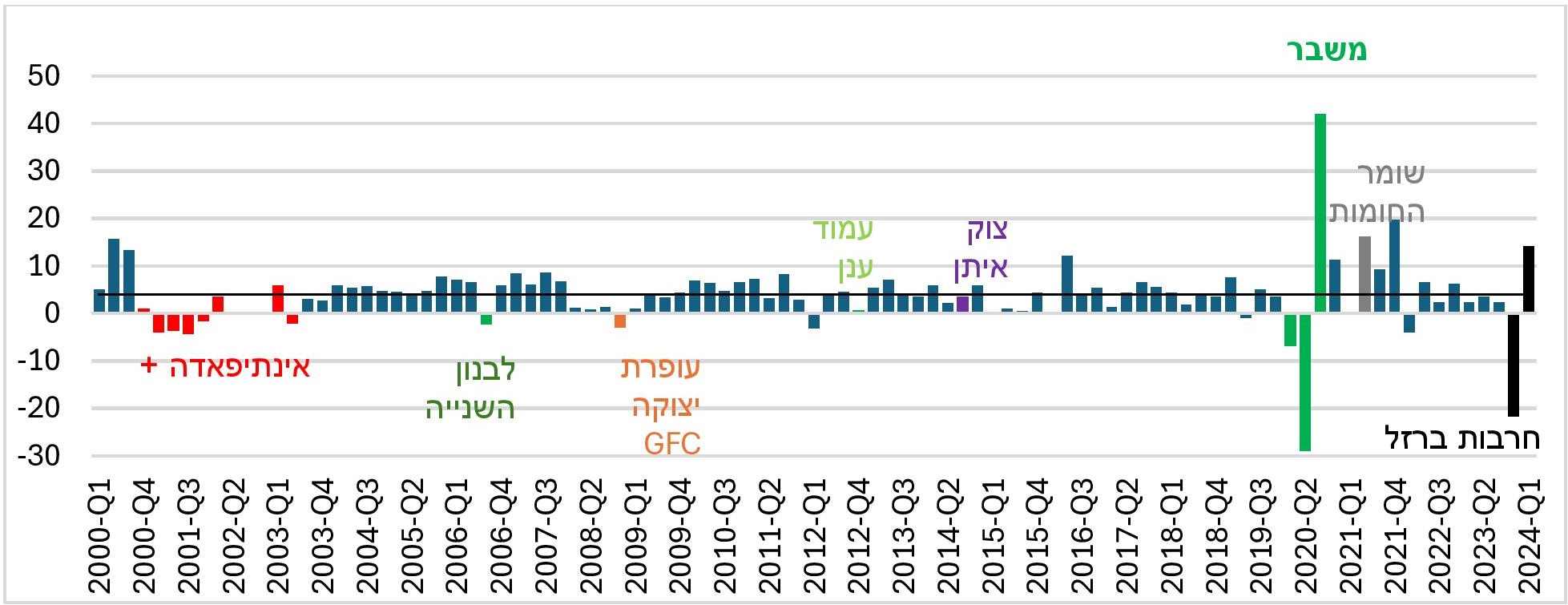 הערה: הקו השחור האופקי מציין את הצמיחה ארוכת הטווח (4%); מקור: הלשכה המרכזית לסטטיסטיקה, עיבודי המכון הישראלי לדמוקרטיה