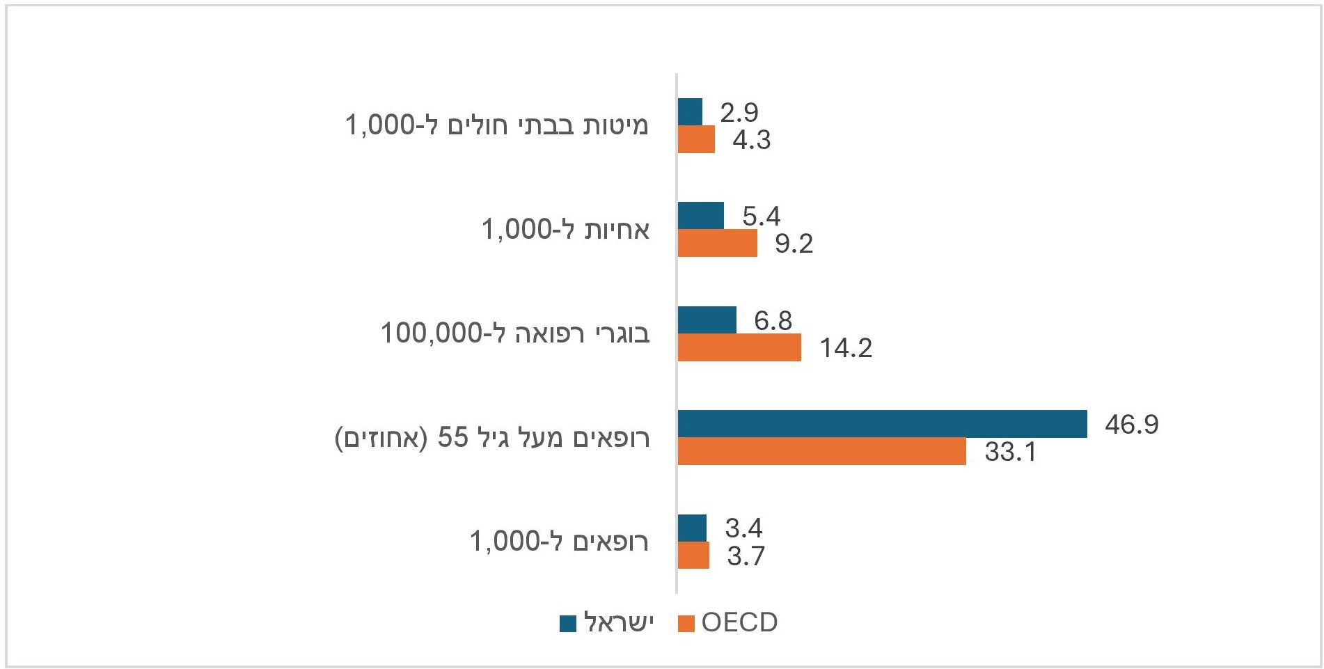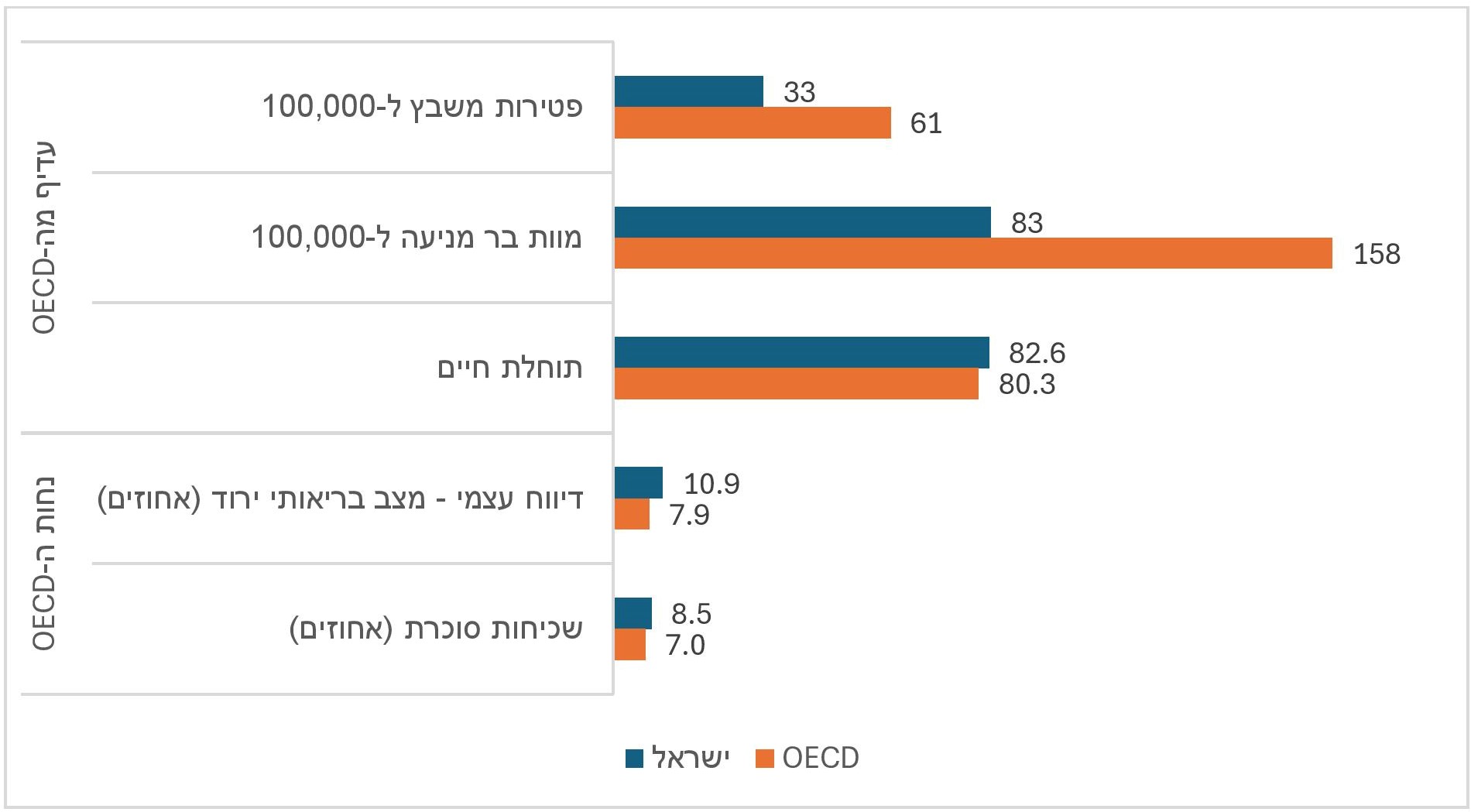 מבחינת ביצועים – ההוצאה על בריאות ביחס לתוצר נמוכה בישראל משמעותית מממוצע ה-OECD (7.4% בישראל לעומת 9.2% ב-OECD). מבחינת מדדי התוצאה יש נתונים טובים (שיעור נמוך של פטירות משבץ ומוות בר מניעה ותוחלת חיים גבוהה ביחס ל-OECD), אך מצד שני הדיווח העצמי הוא על מצב בריאותי ירוד ושכיחות גבוהה מסכרת (תרשים 4). מבחינת תשומות ותשתיות – ההשקעה נמוכה (תרשים 5).