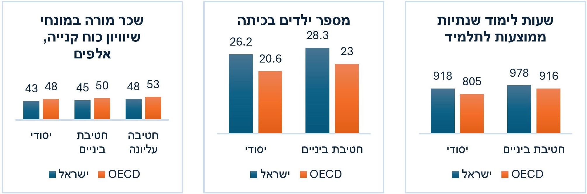 מבחינת מרכיבי ההוצאה, הכיתות בישראל צפופות יותר, השכר נמוך יותר (בעיקר ברמת הכניסה), ויש יותר שעות לימוד בהשוואה ל-OECD (תרשים 6). מבחינת ההישגים, מדורגים נמוך במבחני פיזה ביחס ל-OECD, ליד מדינות כמו צ'ילה, יוון, מקסיקו וטורקיה (תרשים 7).