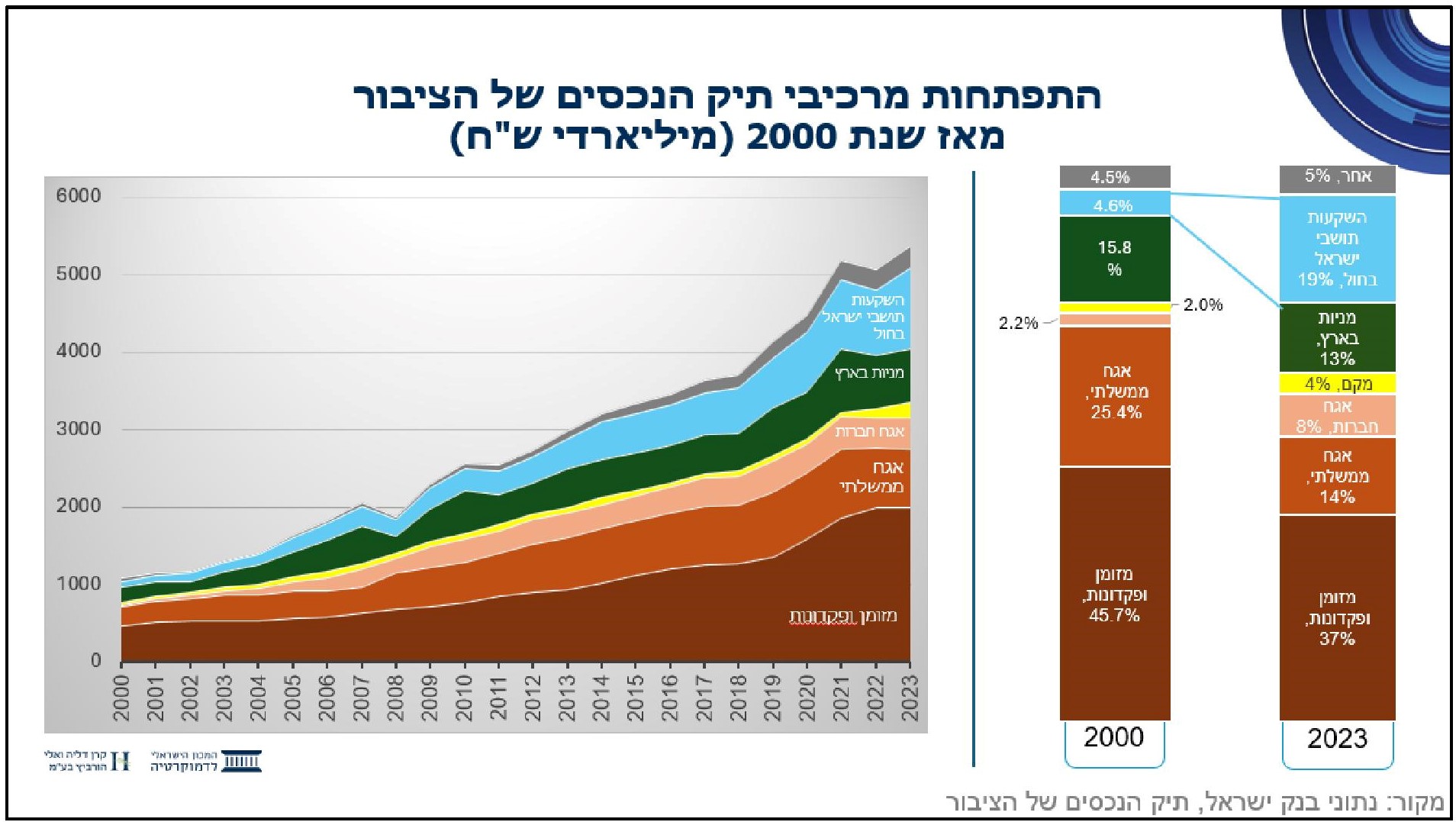 החיסכון והיקף הנכסים של הציבור הולכים וגדלים בקצב יחסית יציב וקבוע. כמו כן ההרכב משתנה. בין 2000 ל 2023 ירידה בהשקעה באג"ח ממשלתי, ובפקדונות ומזומן, ומנגד עלייה בהשקעה באג"ח חברות, ובהשקעות תושבי ישראל בחול.